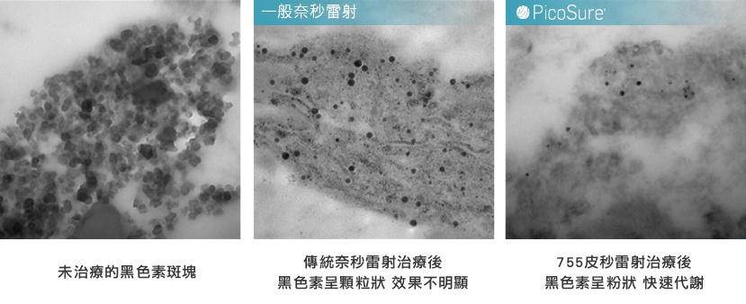 755皮秒雷射(10-12秒)比傳統雷射的治療時間短1000倍,皮秒的作用時間更短、速度夠快,能在極短時間產生「機械光震波」,震波會把黑色素給「震碎」,將黑色素打碎至如粉塵般(比傳統雷射更細小),更容易被細胞代謝移除,所以效果更為明顯;同時較不容易傷害周圍的組織,治療後的副作用較少,較不容易反黑。